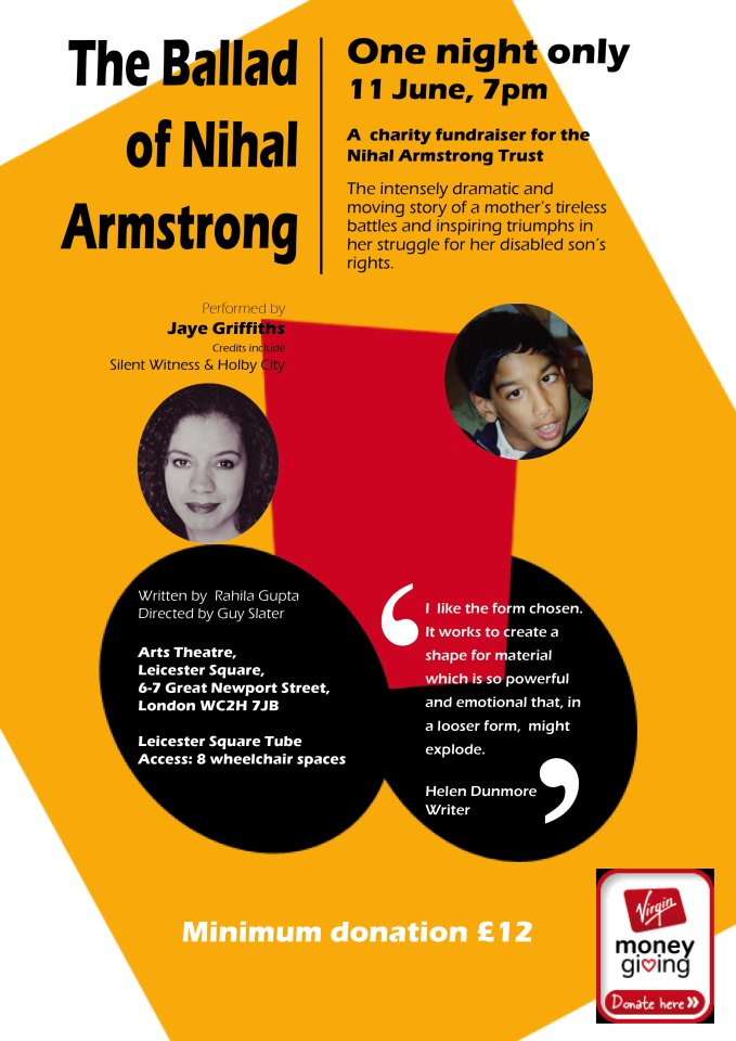 A performance of The Ballad Of Nihal Armstrong- a very moving dramatic monologue written by Rahila Gupta about the triumphs and struggles of life with her son, Nihal Armstrong, who had severe Cerebral Palsy.