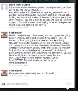 Listen,i stumbled upon this woman,whether she said it,or her son,he learnt that from someone,but we all know that she said it,IMO,so,i wouldnt take this to heart too much ok,shes going to be in the paper tommorow,shes been suspended and rightly so,i never asked for her to comment on an open post i was actually reading at first,my mates post as it goes,there was vile comment by someone else aswell,but,im not going there,she just came in and spouted off,i believe she probably had a glass of wine,watching benefits street on tv and went on a hate campaign,all i did was jioked at first,i did think,cow…as she was all i had no payrise in4.5 years and peasants get one every year,refering too benefit claimees,so i was aware halfway through,i gave her plenty of chances to bail out,apologise,whatever,she just went full assault,even to the point of threatening me with fraud?????? So,i just,like anyone,thought sod that,im not having that,the rest ,well,shes been suspended under investigation,rightly so,then they can see if it was her or her 13 year old son i suppose,its in the Mirror Tommorow too,to me,thats enough now,i dont want any hate campaign please,nor would i like to presume that ALL DWP staff are like this,shes got what she deserves and hopefully the whole service will realise how passionate ,we, the people feel about whats going on today,2014…no way should anyone take what was said as gospel,just need for them to start realising you cant treat or pput everyone in a box and think thats how it is ok…lets move on and keep fighting for some humanity to raise its head and out anyone in the public sector who feels differently,like Katy Hopkins…grrrrrrrrr.