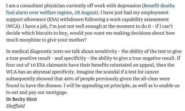 From a doctor, this is damnation on the government’s policy indeed. But then, the DWP’s WCA has never given any credence to the medical profession – who knows, they might bring expert medical opinion to bear on the subject of whether someone is able to work or not. Heaven forbid that someone’s sickness benefit be decided on their actual sickness…