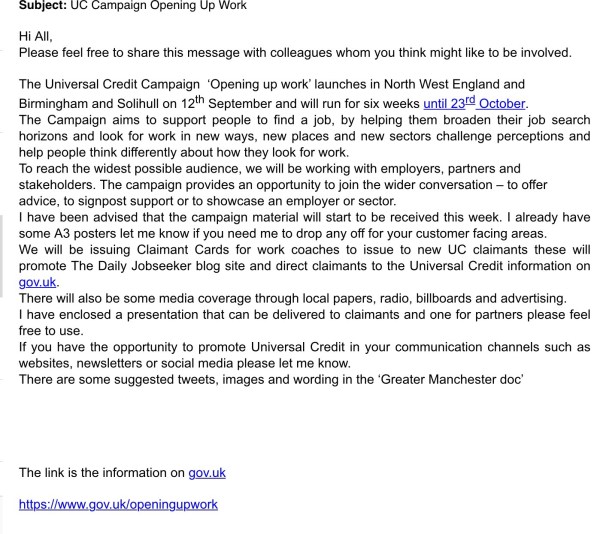 In this email that was sent out, it included a selection of roll out tools for the promotion of Universal credit.