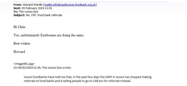 The Eye has asked other foodbanks what their experience is.  Already Eastbourne foodbank has said that referrals have stopped. See below.  The Eye will post further confirmations when they arrive.
