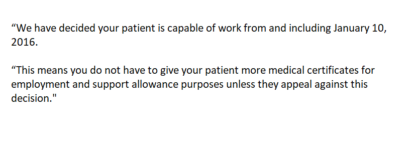 Yesterday on Twitter, I posted one of my previous posts – Jobcentre tells GP to stop issuing sick notes to patient assessed as ‘fit for work’ and he died – in which I discuss a letter addressed to a GP regarding a seriously ill patient. It said: