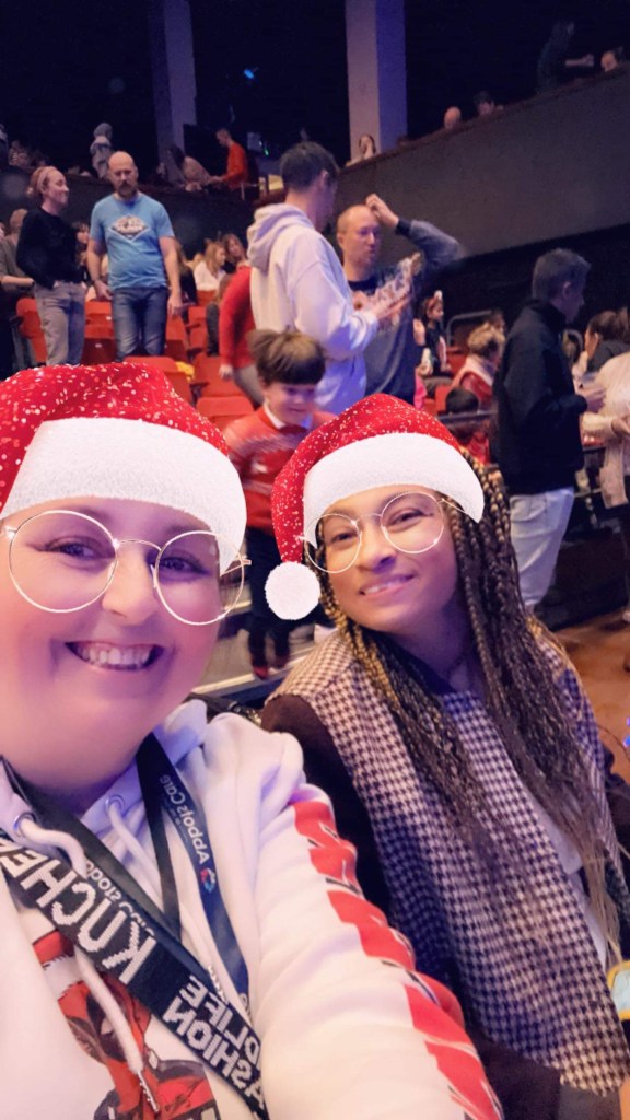 having fun during the panto intro with one of my team of personal assistance and my day like crap and passport pleasure friends when I went to the panto yesterday