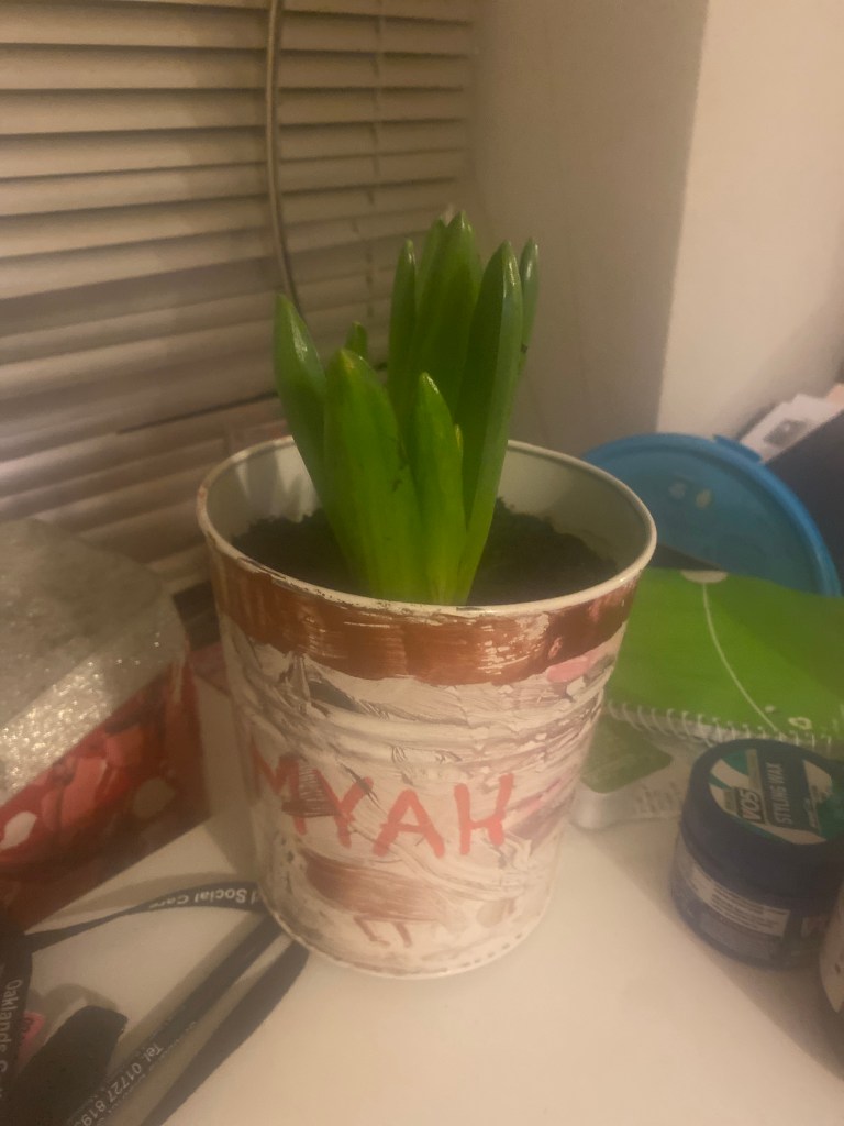 so seeing my hyacinth that I planted at the day service are now growing in the pot that i decorated they also healthy and so tall , they’re so lovely
