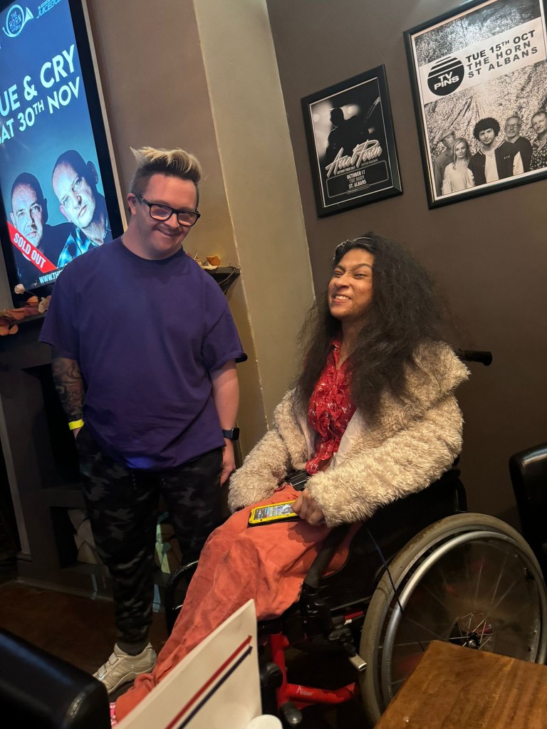 here are some pictures of. What I did on Saturday night and how my personal assistant gave me independence to go to the pub where I bumped into a friend who is a stage assistant this is what it’s all about being included within my community my PA gives me independence freedom and social interaction