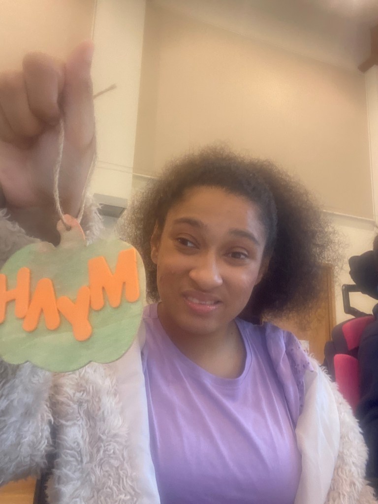 Me holding my pumpkin which I painted and stuck my name on it on Monday. showing it up to you in this picture with me and my artwork.