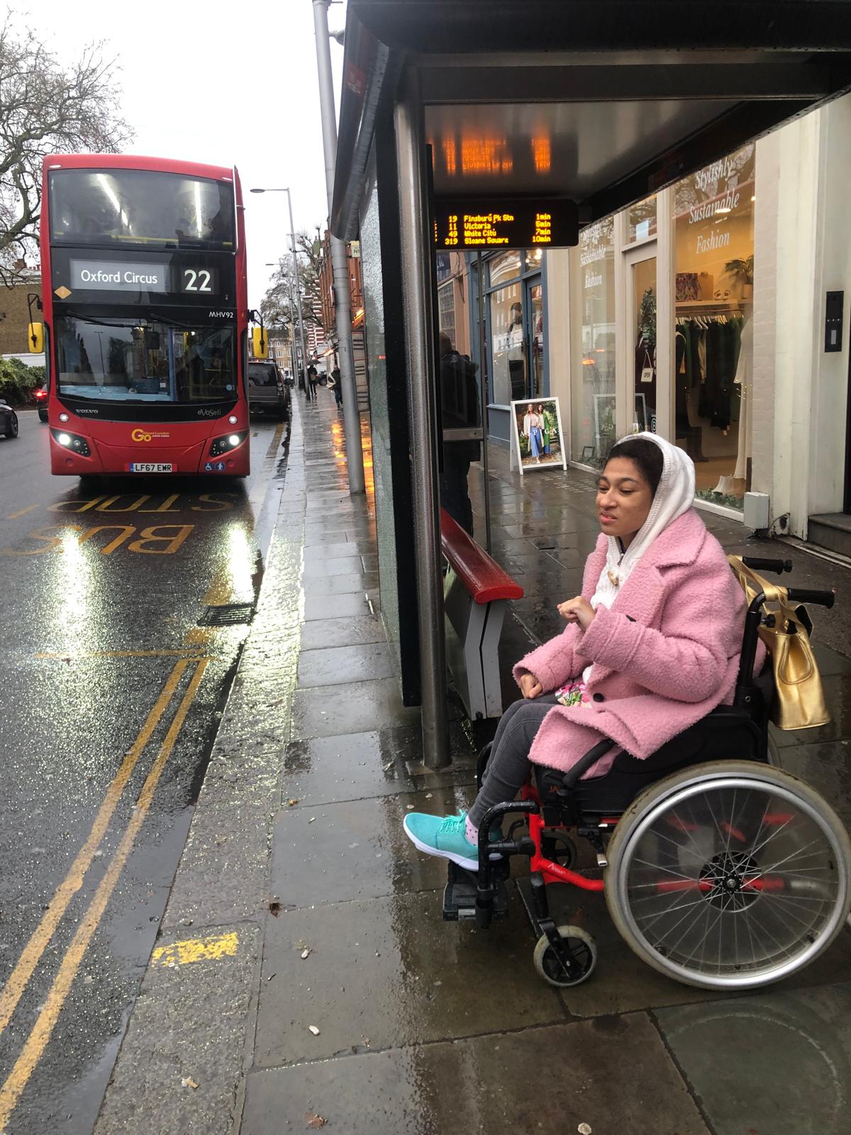 Waiting at the bus stop in London ready to go to Science Museum and being independent with the help of my PA