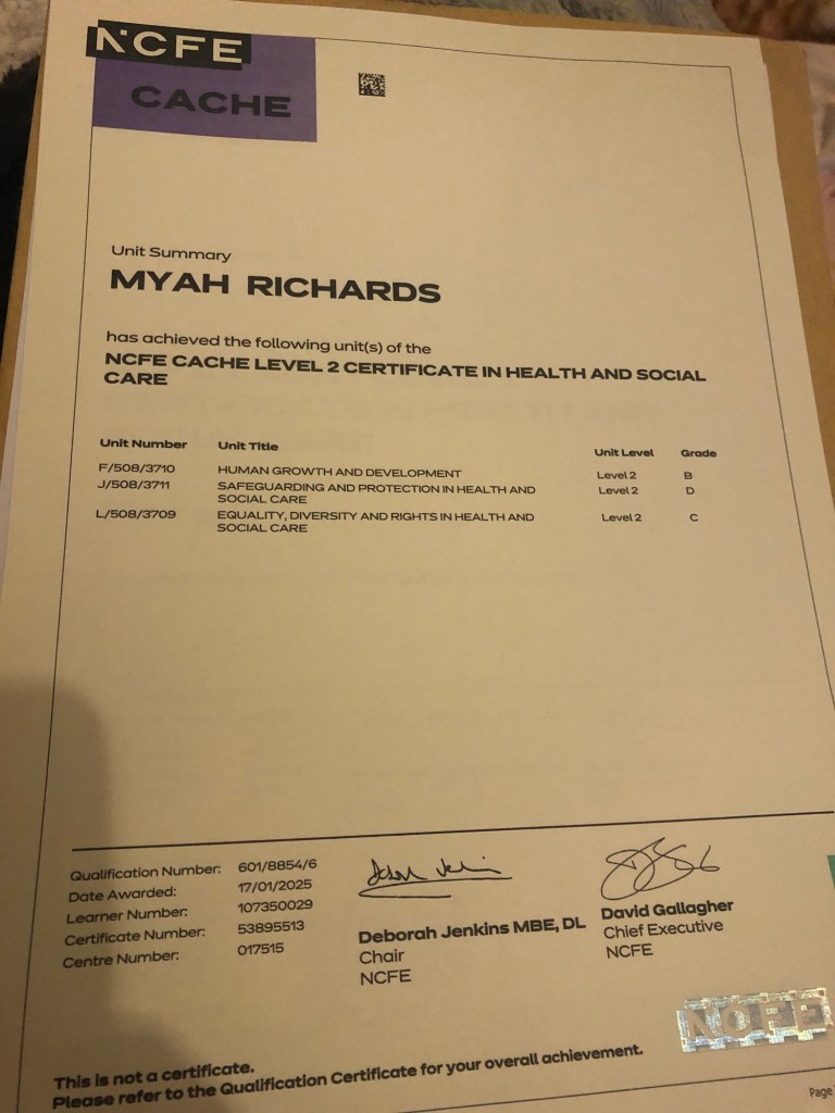 Who is one of my achievements, which I didn’t let social services and other funding providers stop me from achieving here is my academic achievement for 2025. My last one 2025. My next one will Qualified and proud to say I am qualified in level two health and social care plan is to do childcare as of September 2025 and then can you delete that in September 2026 or 27, depending on where do I go on the one or two vehicles but there is a prove to you to not let what they say negatively to try and put you off. Don’t collect them because you can achieve in this certificate right here is the proof that you can do that. be in 2026+20,27
