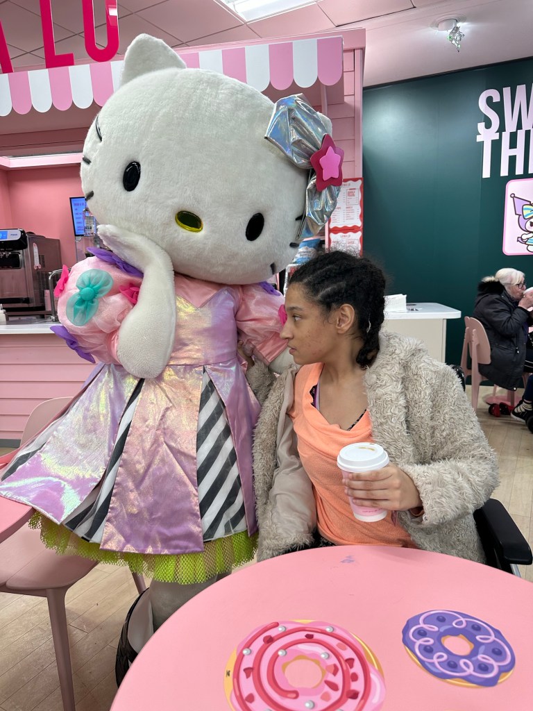 Me and hello Kitty celebrating the character and shows birthday in the hello Kitty café on Saturday me hugging the hello Kitty