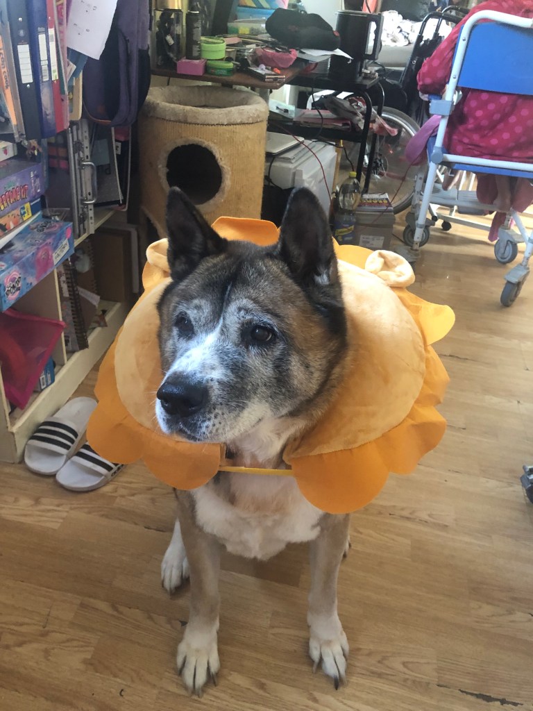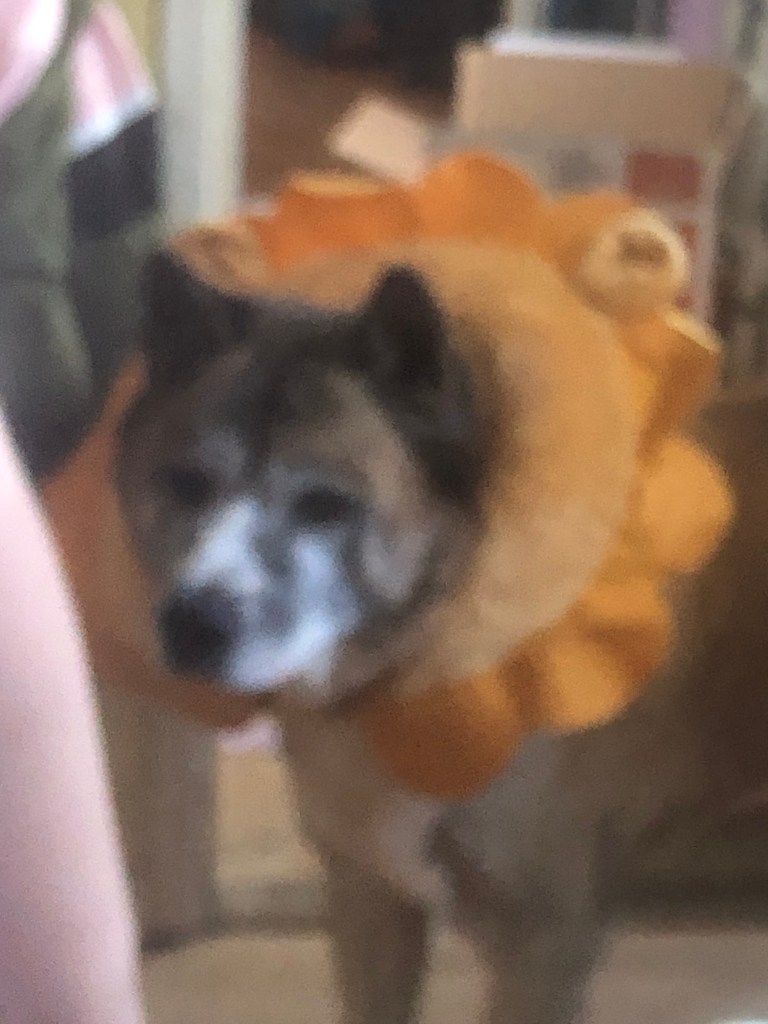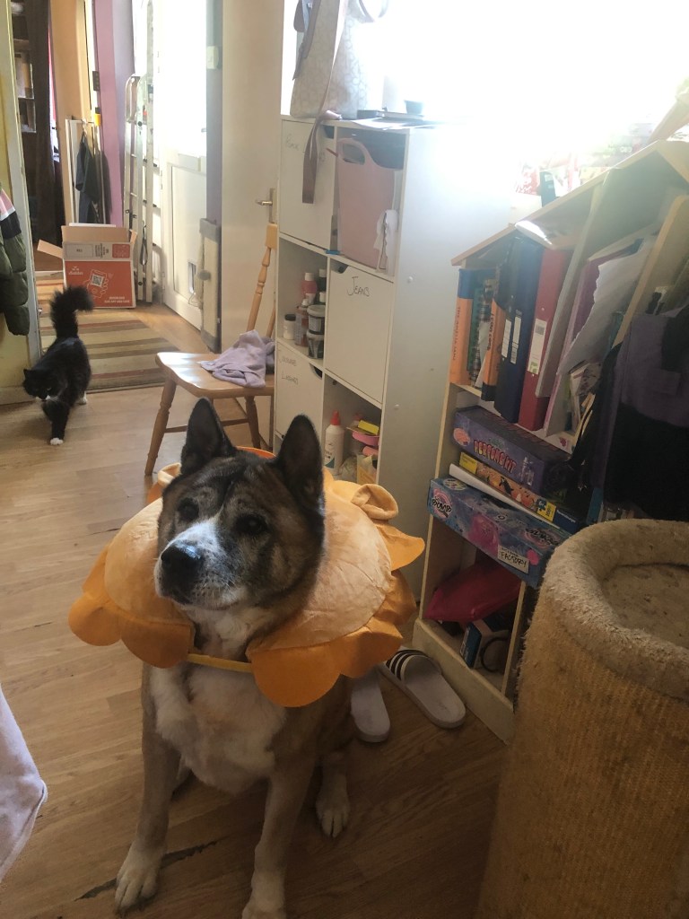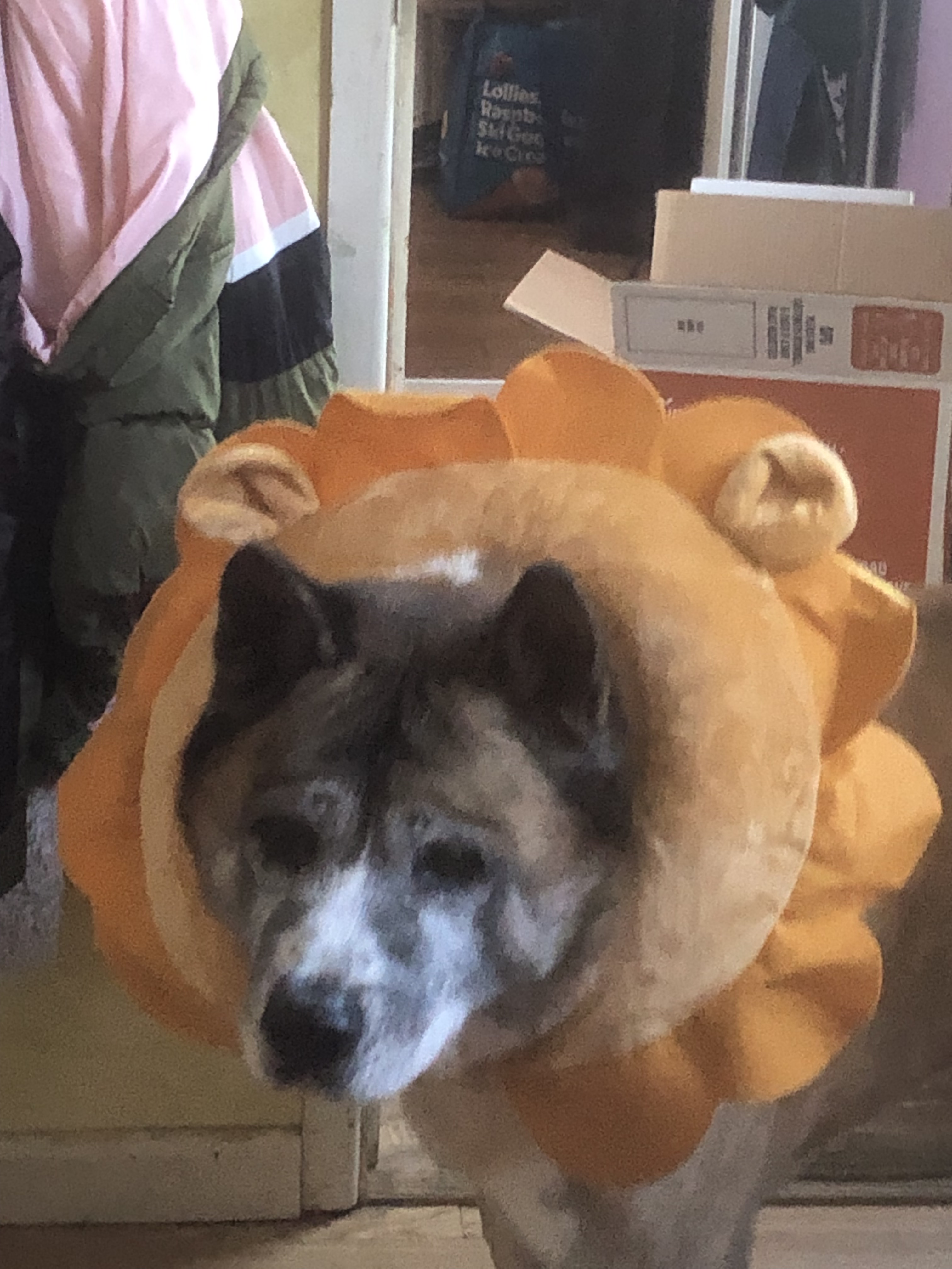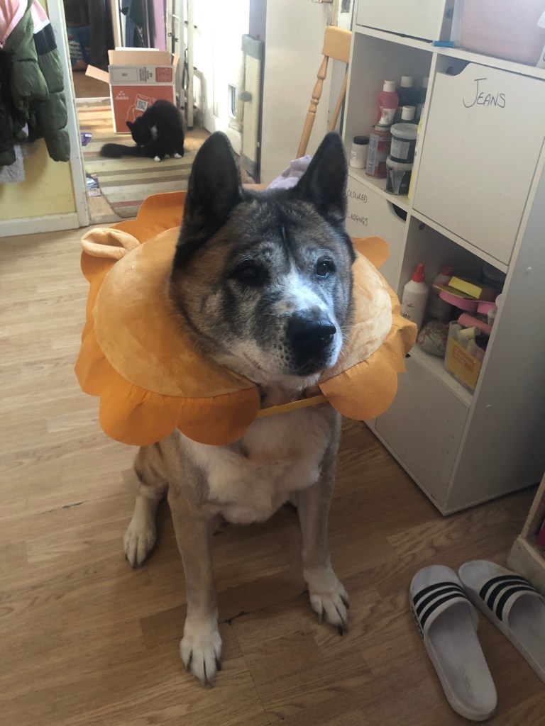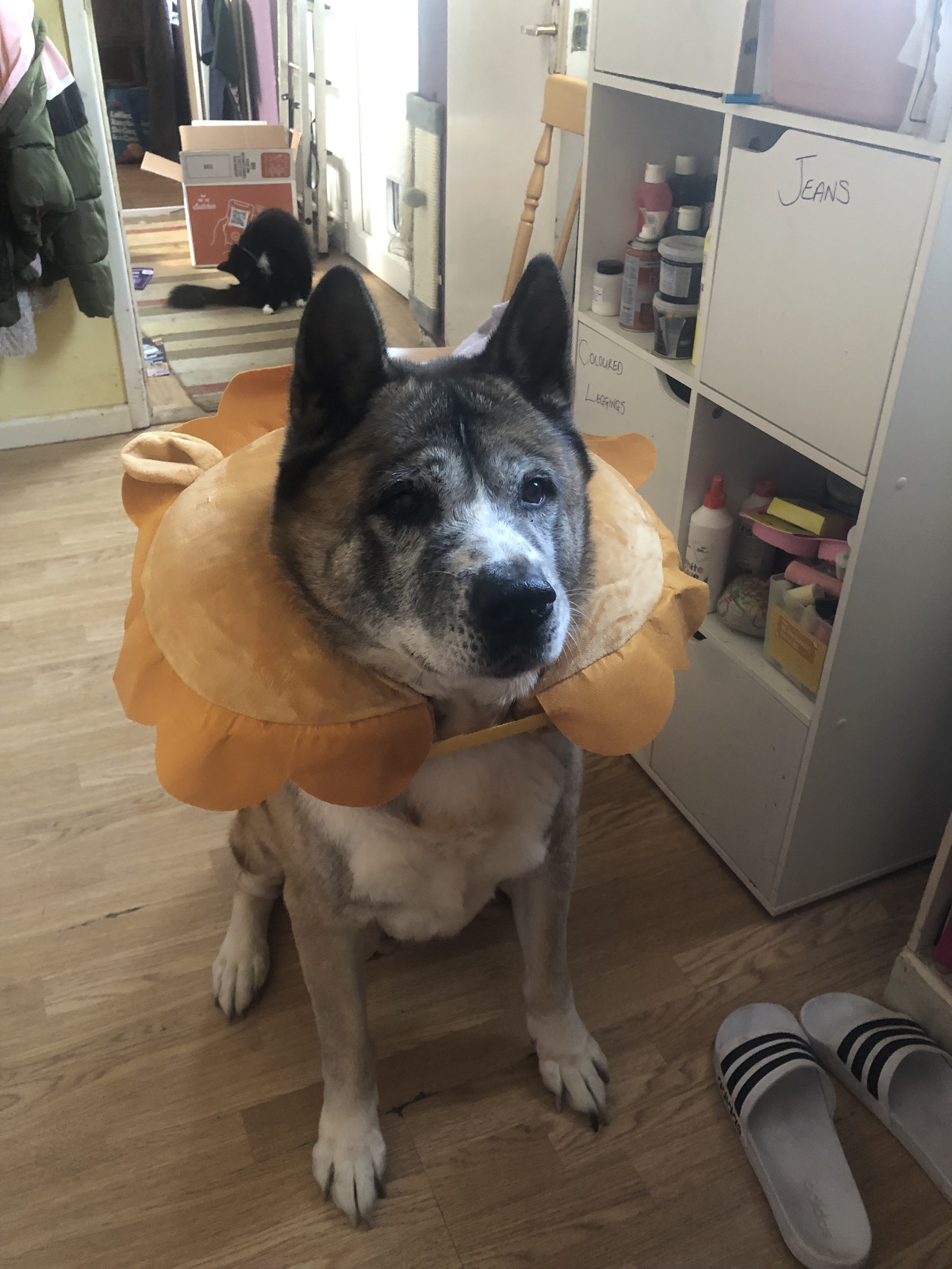 When your dog has to wear the cone of shame lying edition. When your Japanese Akita dog has to wear the cone of shame because of his hay fever in the summer and the cone of shame that your mum buys him is so cute that he becomes your little lion and looks so photogenic and stand there for the camera cutest cone of shame ever cutest deterrent from him scratching himself, who else thinks this is cute if anybody else wants one, they sell them on Amazon and you just blow them up and they’ve got in many different styles to suit any dogs cheekiness and personality. #MeetFoxyTheLion
