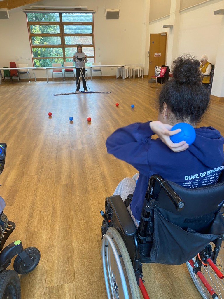 me playing butcher with my wacky wheels Monday Great which is a form of bowls for wheelchair and limited mobility aid users I enjoyed this adaptive Team sport and here is me showing off my most amazing shot