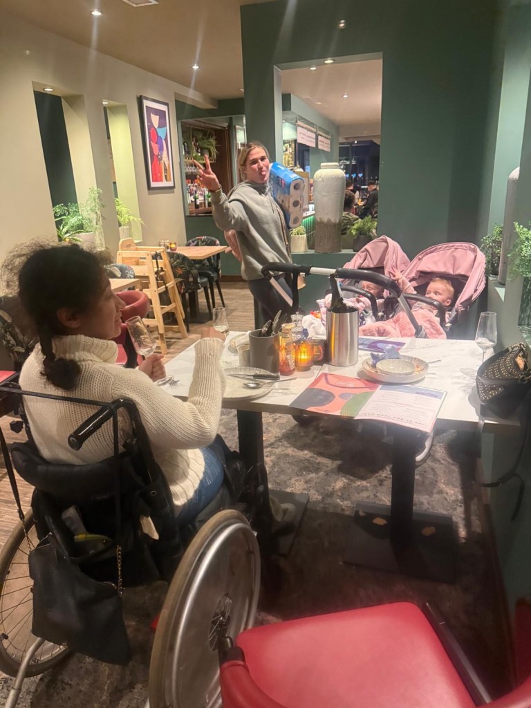 Out for lunch with my best friend and her twins, who I am Aunty on Wheels by choice this is why Respite Care matters and we should be supported to have access to the rest that suits her rather than trying to force us into a Respite Care home because for me I need my specialist team with me at all times due to my functional neurological disorder because anybody that follows me on here all know with that and you never know what it’s gonna do at any time it has its mind of time and plays whatever games it feels like does this condition that’s why I’m advocating for appropriate respite for all but especially those with FND and dynamic conditions we should have this funded by health and social care and not have to rely on charitable funding to enable to do this because the tweezer is if the charity doesn’t give me the money I don’t do it.