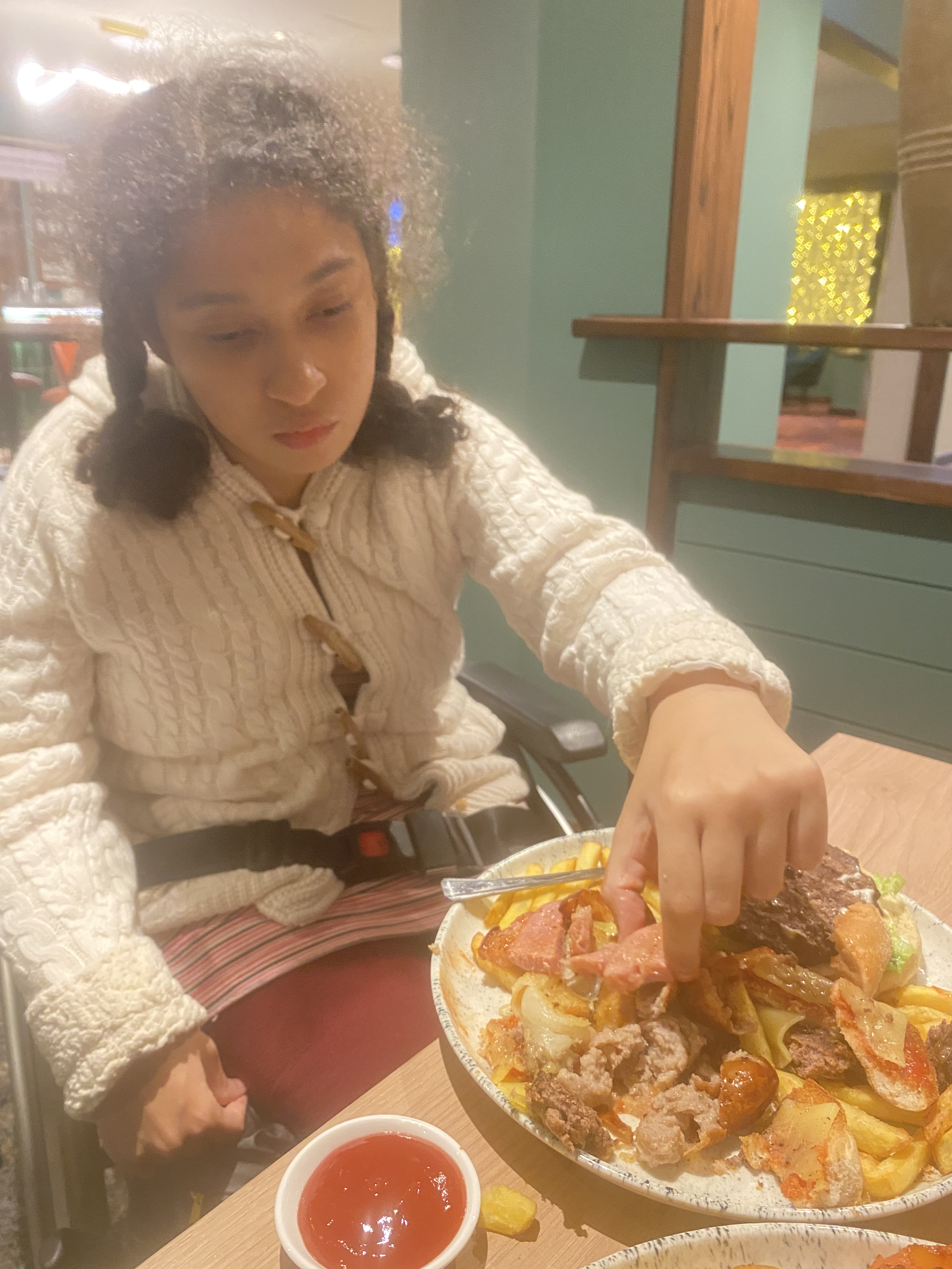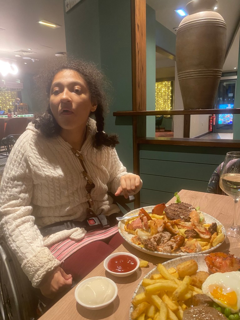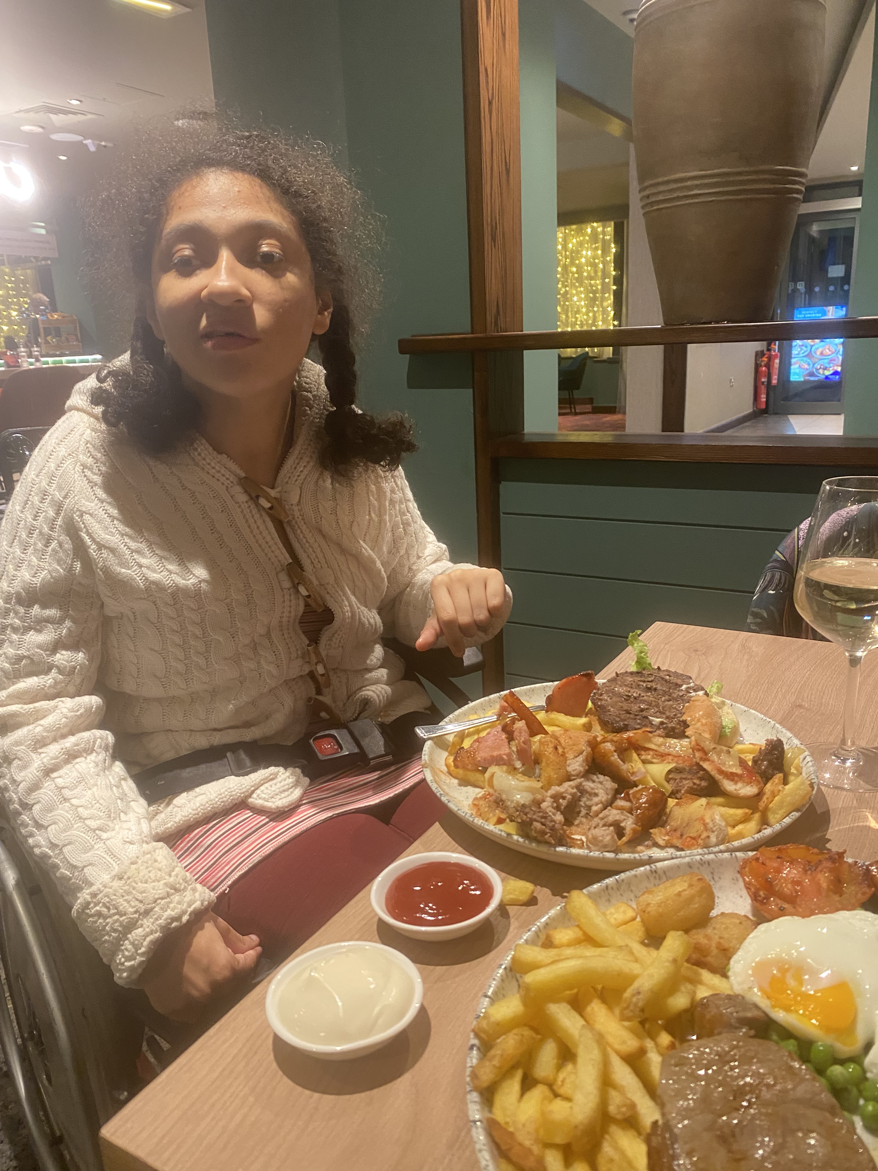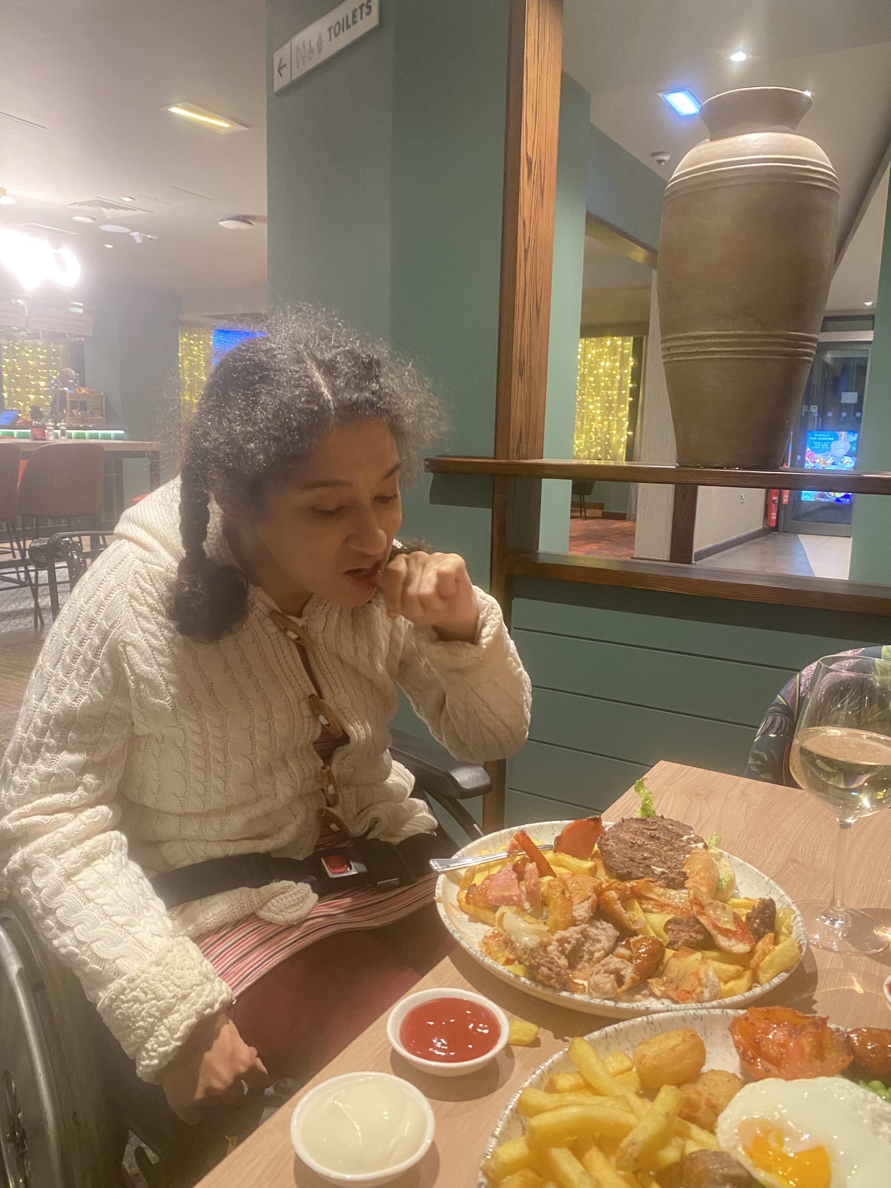 Evening out for dinner with my living personal assistant that I had for my Respite Care trip. My team really do make all the difference to my freedom and my independence!