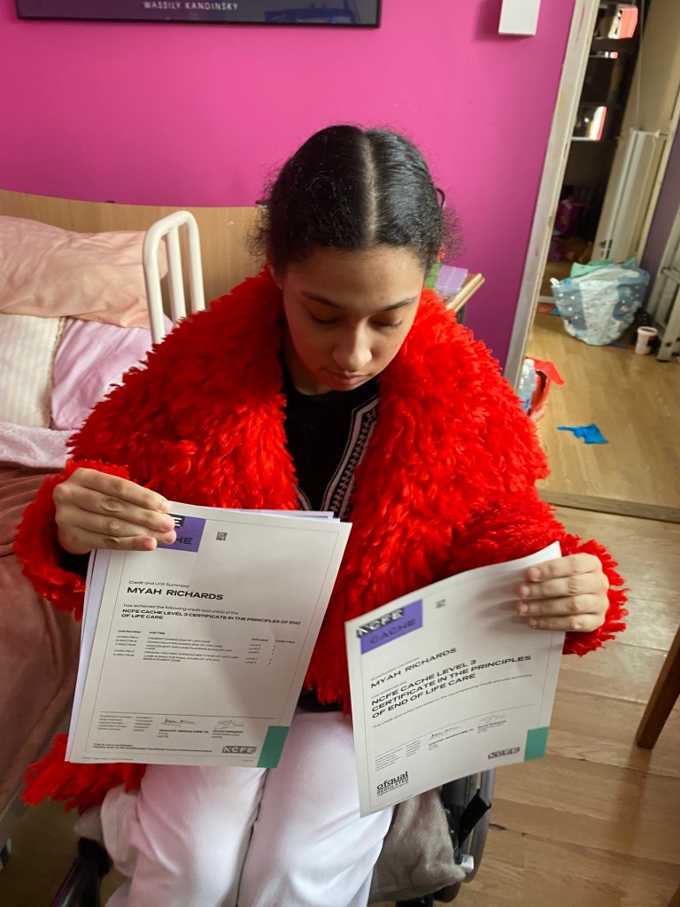 First student win of the year. I passed my level three end of life and palliative care diploma, here I am proudly showing off my diploma certificate. I worked so hard for them, because we’re disabled it doesn’t mean we can’t achieve. Opinions of funding bodies and local authorities need to change because we can achieve! We need support from them that cost money that they can’t be bothered to invest in us.