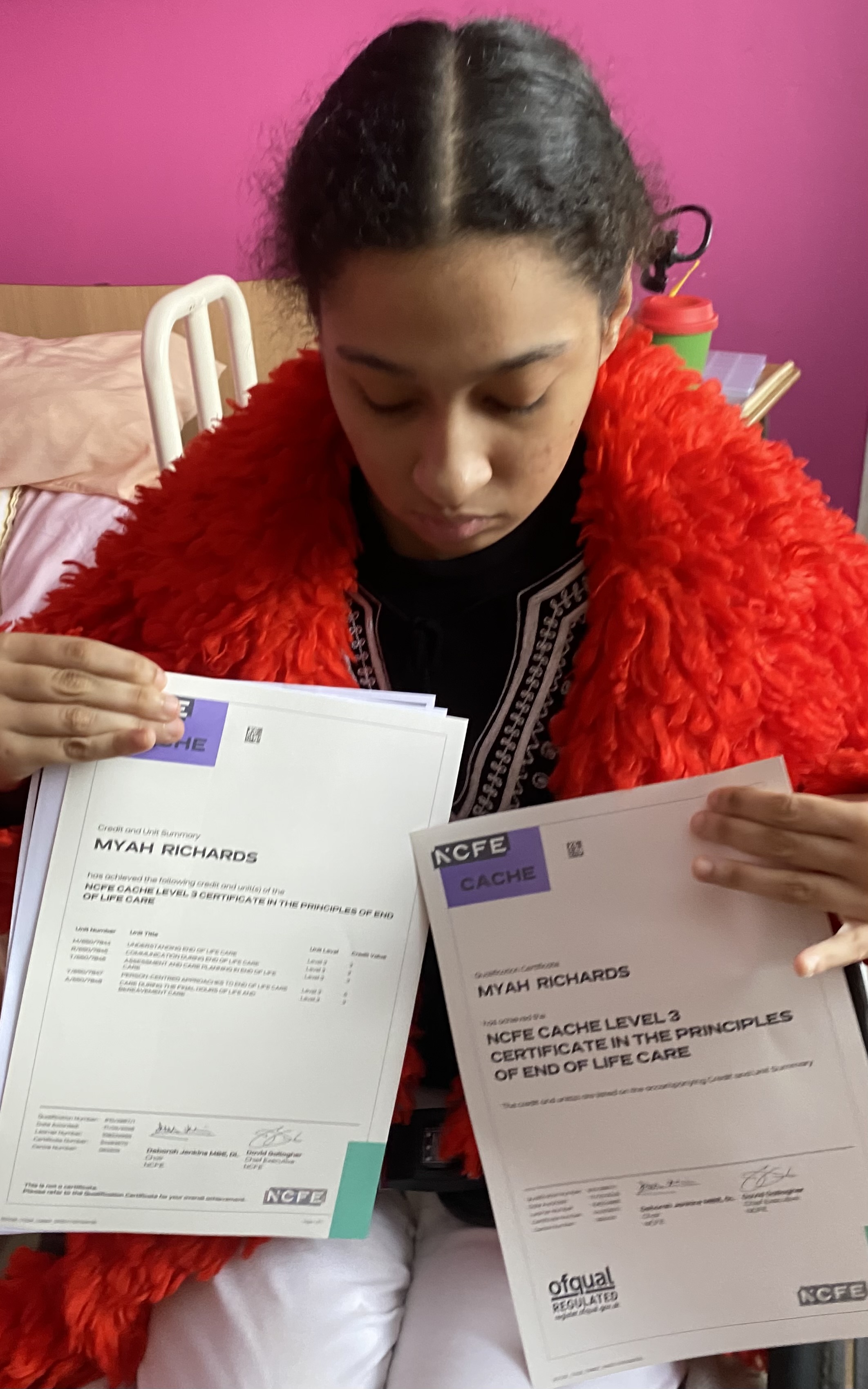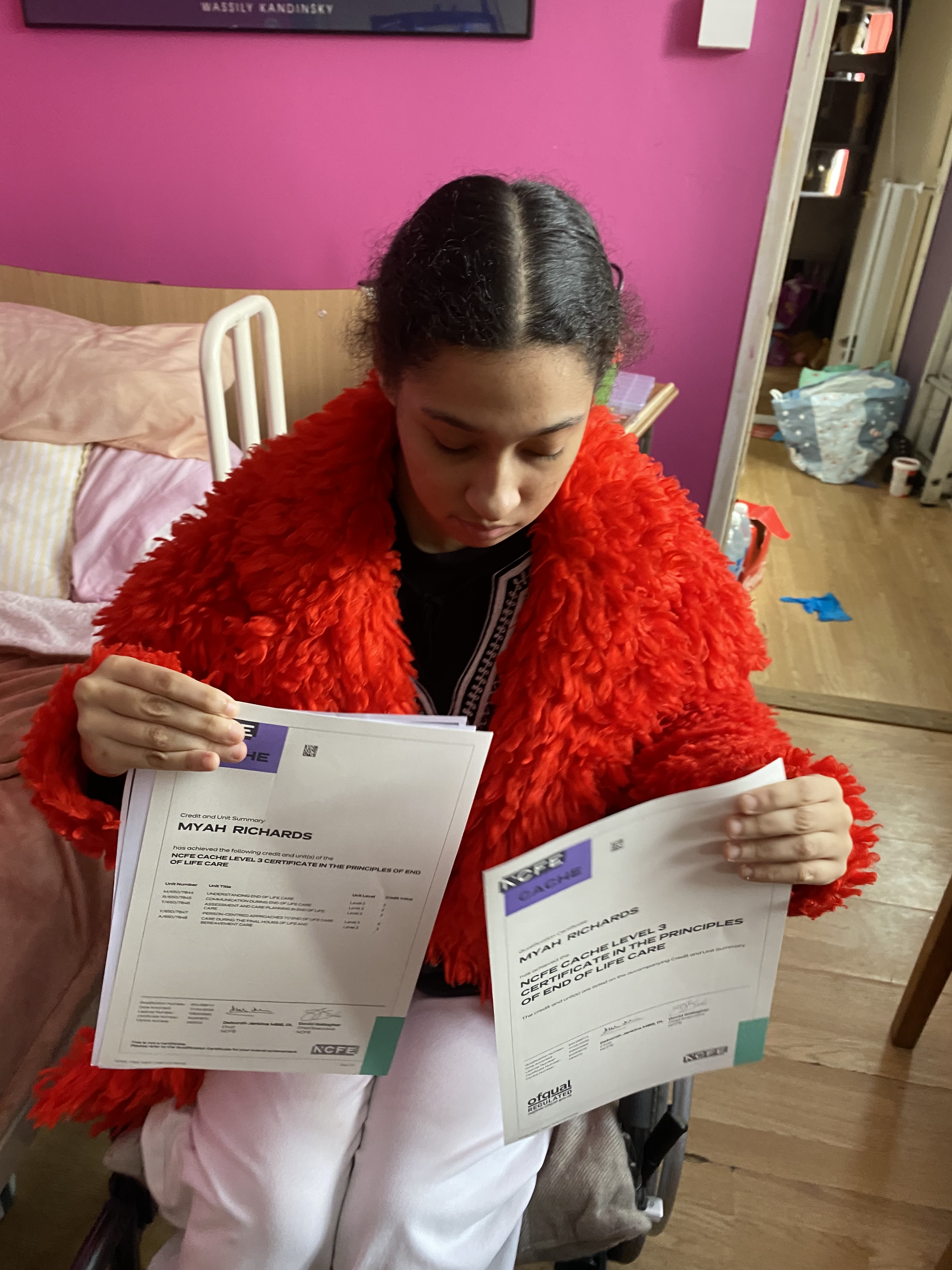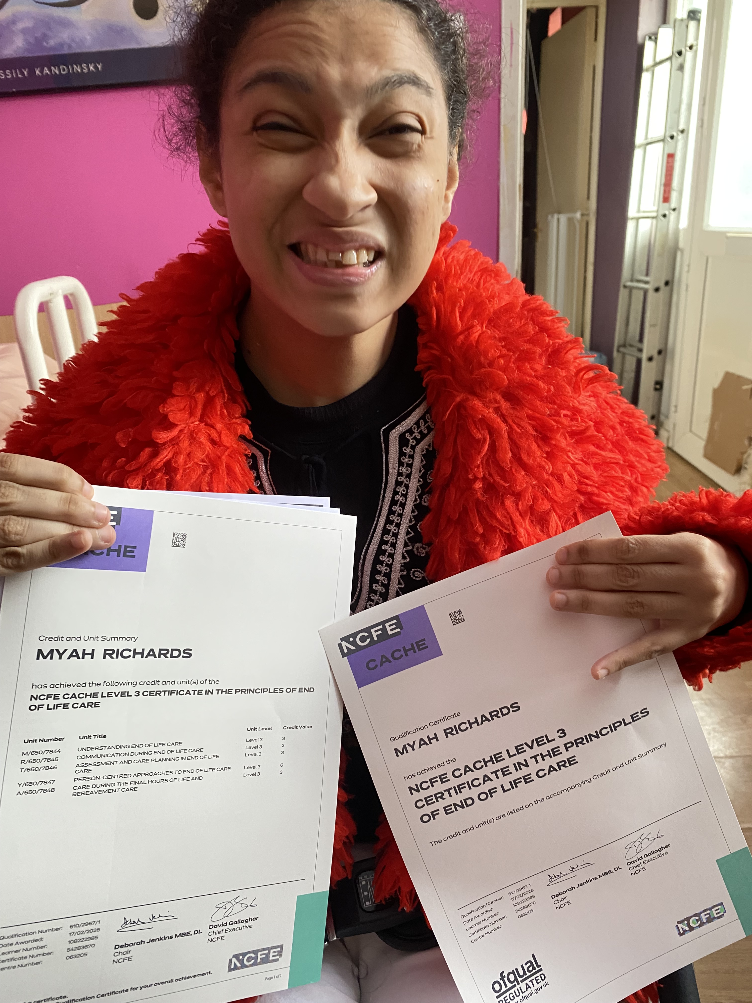 First student win of the year. I passed my level three end of life and palliative care diploma, here I am proudly showing off my diploma certificate. I worked so hard for them, because we’re disabled it doesn’t mean we can’t achieve. Opinions of funding bodies and local authorities need to change because we can achieve! We need support from them that cost money that they can’t be bothered to invest in us.